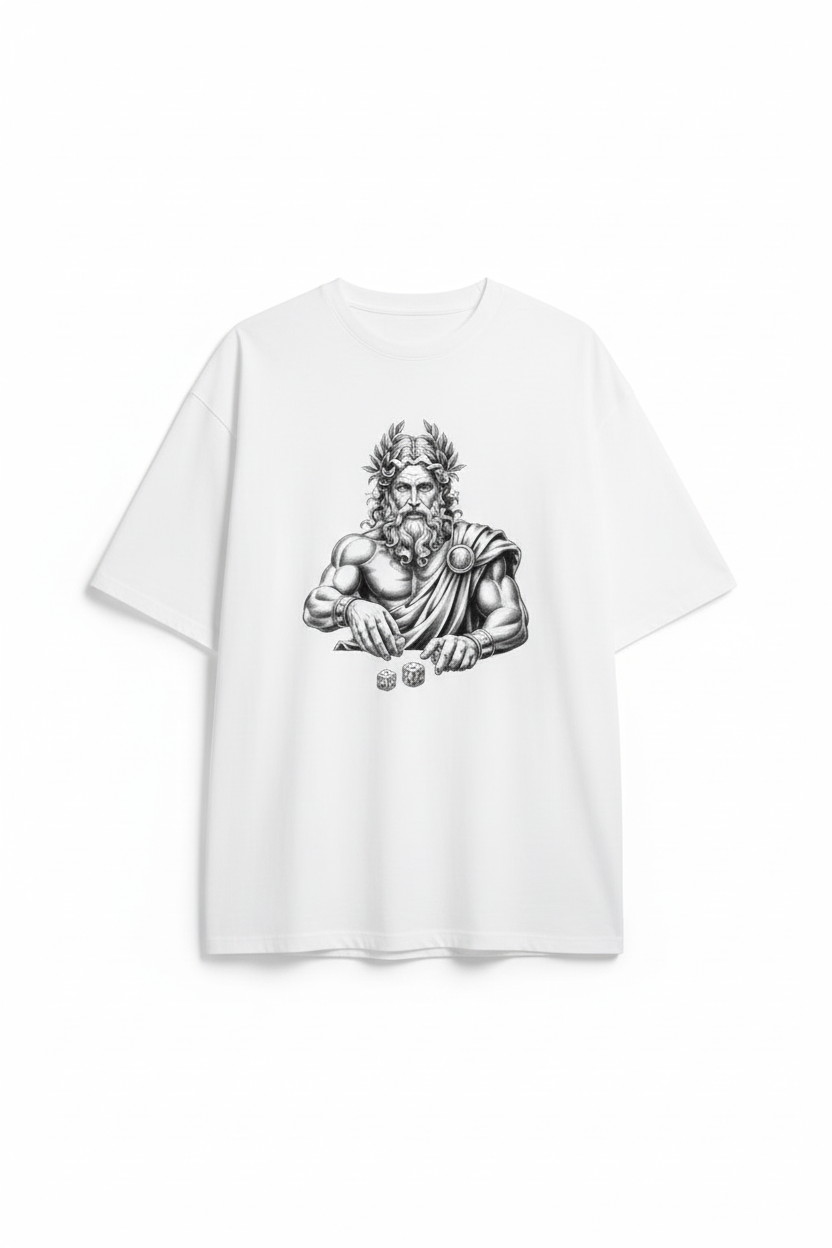 Classical mythology meets premium streetwear. This oversized tee features a detailed Greek god illustration with laurel crown and dice on heavyweight cotton, delivering timeless artistic style with superior comfort.