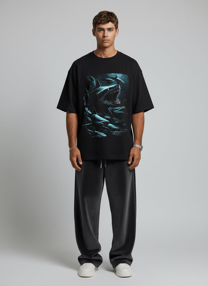 Deep ocean intensity meets premium streetwear. This oversized tee features a dramatic shark swarm graphic with teal atmospheric lighting on heavyweight cotton, delivering powerful marine-inspired style with superior comfort.