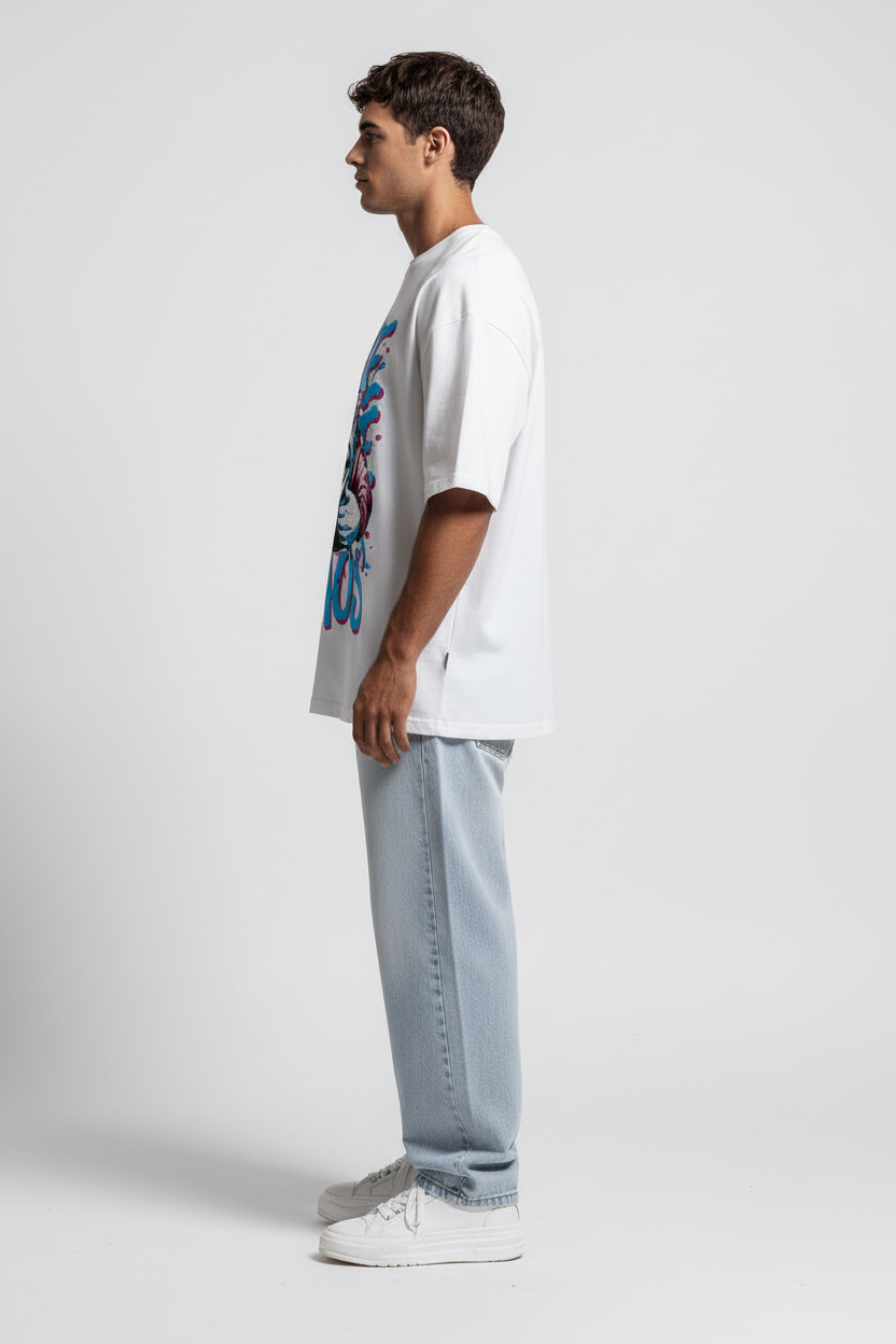 This high-impact piece features a vibrant, multi-colored street-art graphic of a snarling character centered on a crisp white backdrop. Cut in our signature oversized silhouette with dropped shoulders and a heavy-gauge 100% Egyptian cotton build, it offers a premium, structured feel that lasts. The bold "BITE THE CHAOS" typography and energetic, graffiti-inspired art style make this a standout statement piece that combines raw urban aesthetics with a modern, architectural drape.